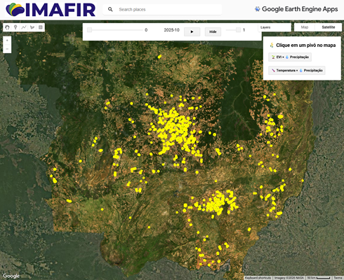 A interface apresenta um mapa interativo com a localização dos pivôs cadastrados pelo laboratório, permitindo a seleção individual das áreas e a navegação temporal. A aplicação realiza o cálculo automático do EVI (Enhanced Vegetation Index) a partir de dados orbitais, confrontando esses resultados com os dados georreferenciados dos pivôs, possibilitando a análise do vigor vegetativo e da dinâmica das culturas ao longo do tempo.